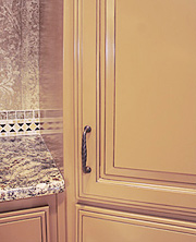 Kitchen The walls and ceiling feature multiple layer glazing with enhanced shadows and highlights, for the cabinets we used a tinted stain accentuating decorative crown moulding. The door and floor trim is faux wood with gold highlights. The venthood features a light gold glazing over a crackle finish.