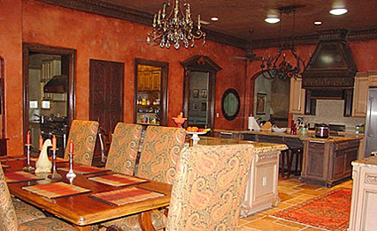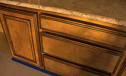Kitchen The walls and ceiling feature multiple layer glazing with enhanced shadows and highlights, for the cabinets we used a tinted stain accentuating decorative crown moulding. The door and floor trim is faux wood with gold highlights. The venthood features a light gold glazing over a crackle finish.